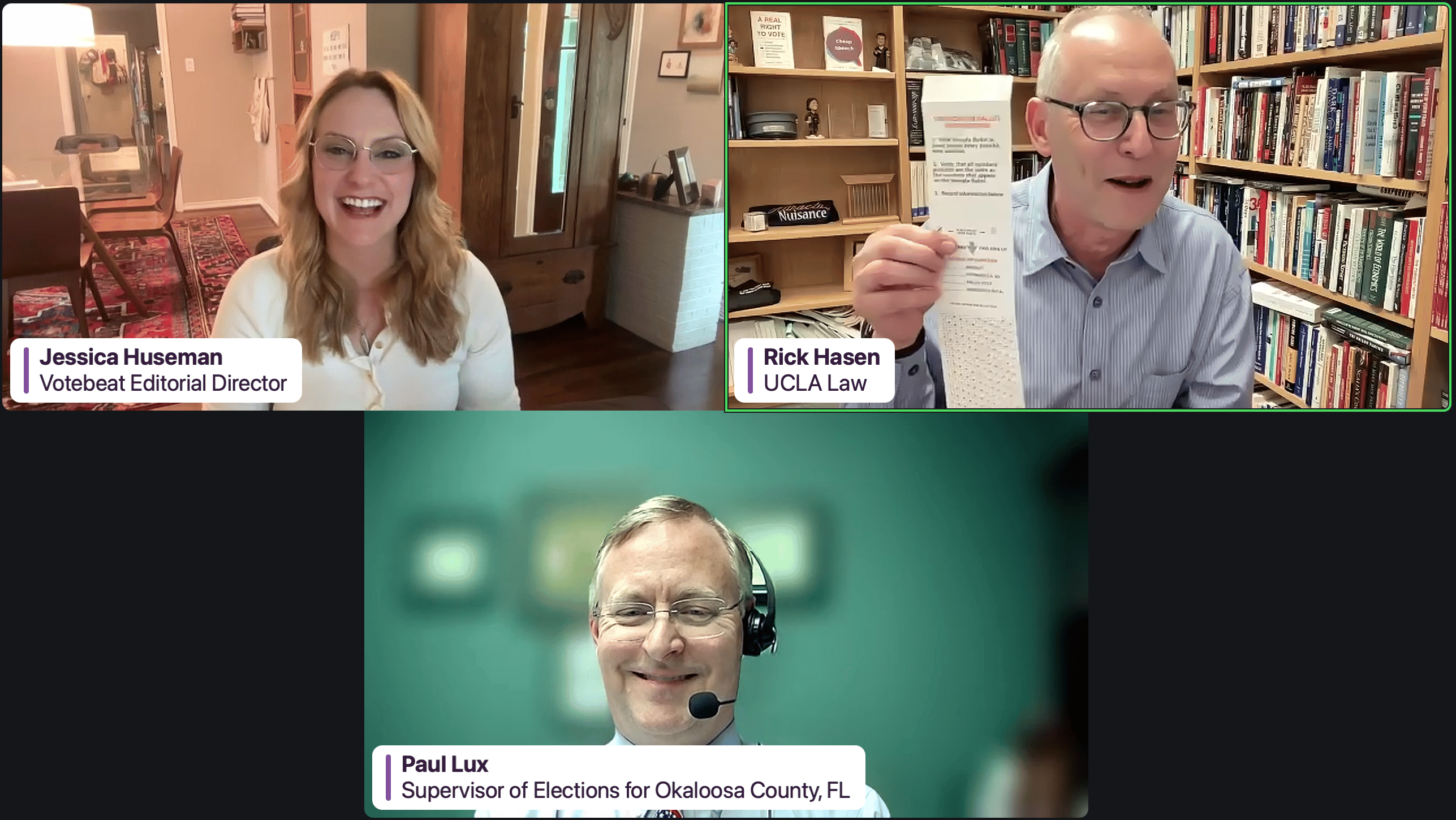 Did you catch our event on Thursday? I joined UCLA election law professor Rick Hasen and Okaloosa County, Florida, Supervisor of Elections Paul Lux to talk about how the 2000 election still shapes how elections are run today. The highlight was undoubtedly when Paul showed us an actual voting station from 2000 that he keeps in his office! You can watch the full discussion here.